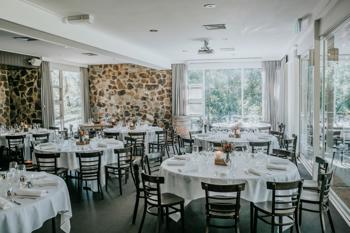 Featuring timeless stonewalls and expansive glass windows, the Brolga Room offers a view of the lush, sprawling lawn, creating a harmonious blend of