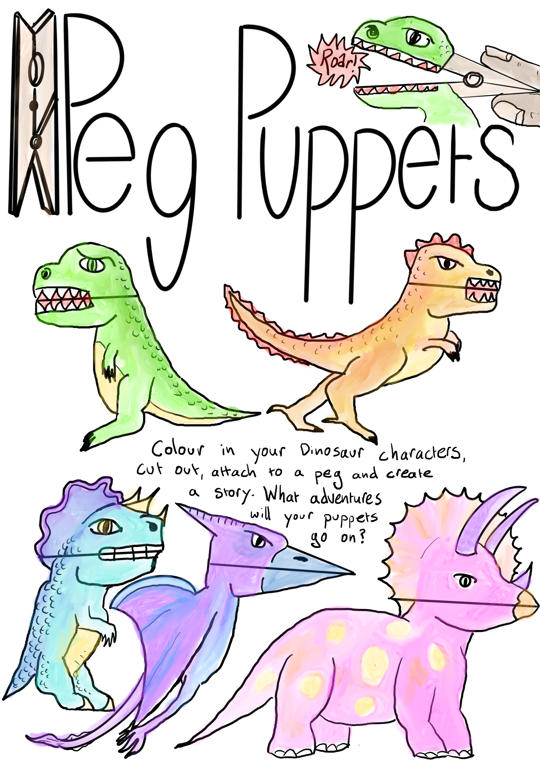 Colour in, cut out and stick these Dinos to pegs so they can open their mouths, I wonder if they are looking for food, or making a sound?