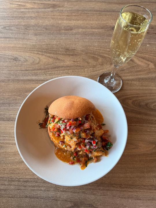 - Chicken curry served in a crusty bread roll with tomato and red onion sambal.